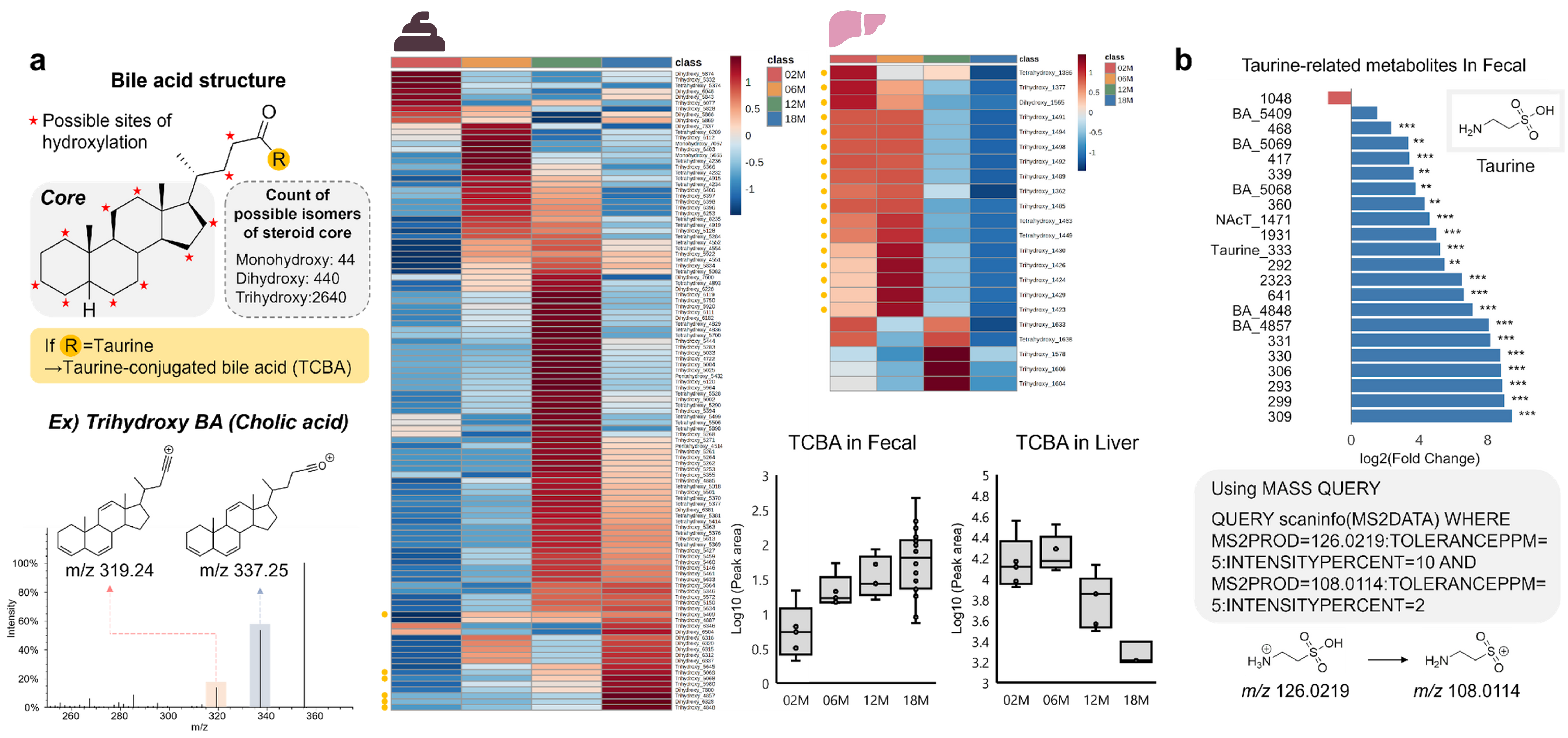 - 질량분석 기반 구조 동정: MS/MS fragmentation 패턴을 활용하여 타우린 결합 담즙산의 구조를 정밀 동정하였습니다. 특히 precursor ion (m/z 126.0219, taurine) → product ion (m/z 108.0114, dehydrated taurine) transition을 이용한 targeted MS2 분석을 통해 TCBA 화합물을 선택적으로 스크리닝하였습니다. (in preparation)
